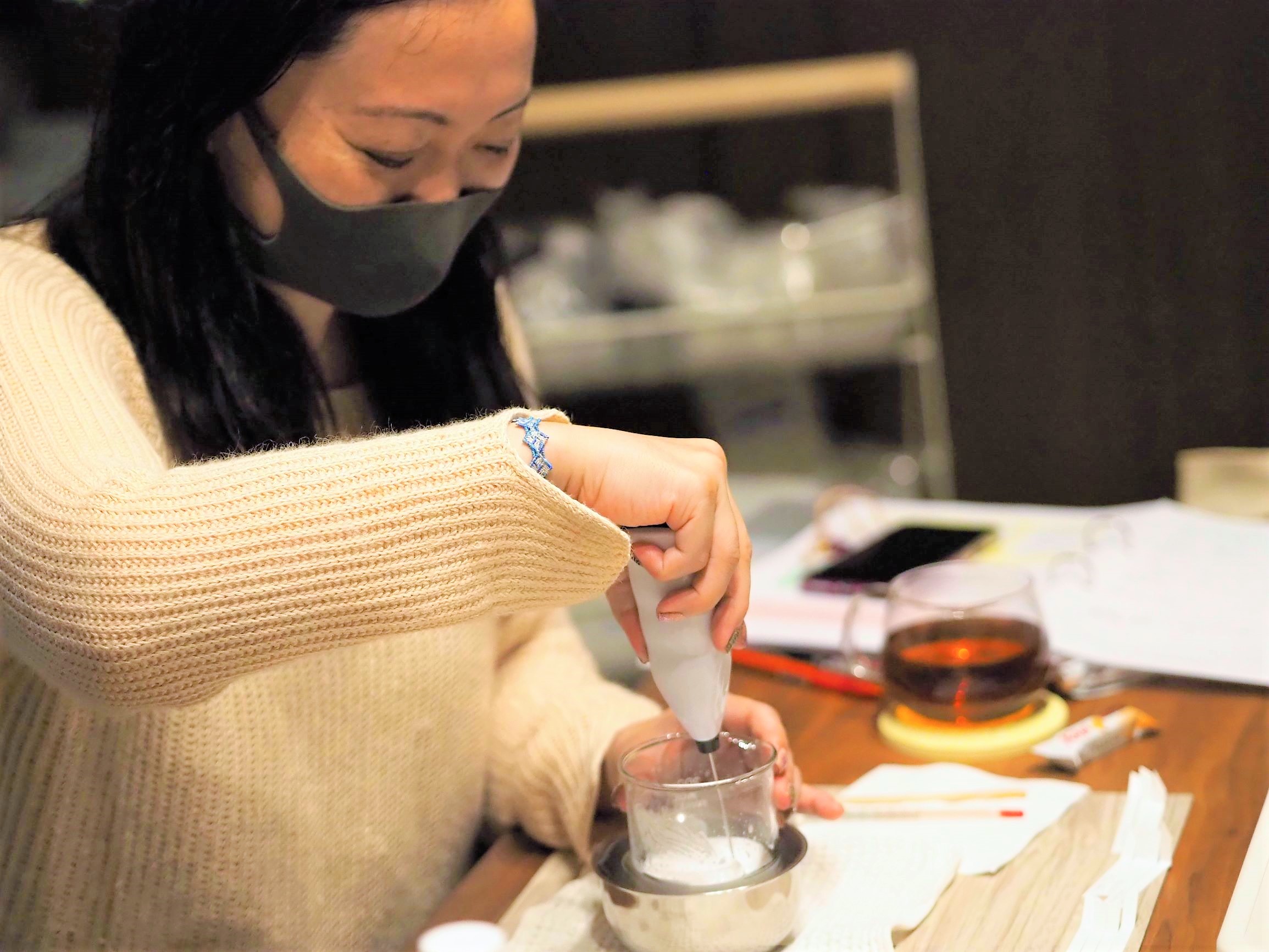 心地よい精油の香りに包まれながら、ふわふわなアロマクリームを泡立てていくひと時。